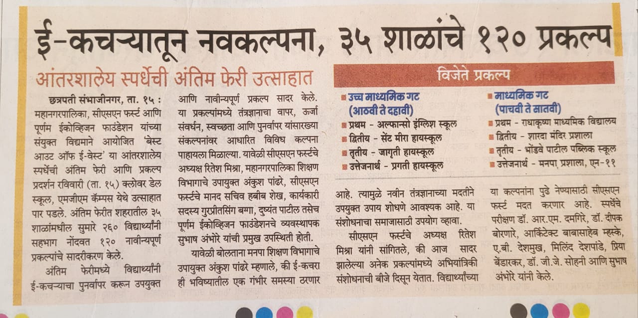 महानगरपालिका, सीएसएन फर्स्ट आणि पूर्णम ईकोव्हिजन फाउंडेशन यांच्या संयुक्त विद्यमाने आयोजित 'बेस्ट आउट ऑफ ई-वेस्ट' या आंतरशालेय स्पर्धेची अंतिम फेरी आणि प्रकल्प प्रदर्शन रविवारी (ता. १५) क्लोवर डेल स्कूल, एमजीएम कॅम्पस येथे उत्साहात पार पडले. अंतिम फेरीत शहरातील ३५ शाळांमधील सुमारे २६० विद्यार्थ्यांनी सहभाग नोंदवत १२० नावीन्यपूर्ण प्रकल्पांचे सादरीकरण केले.